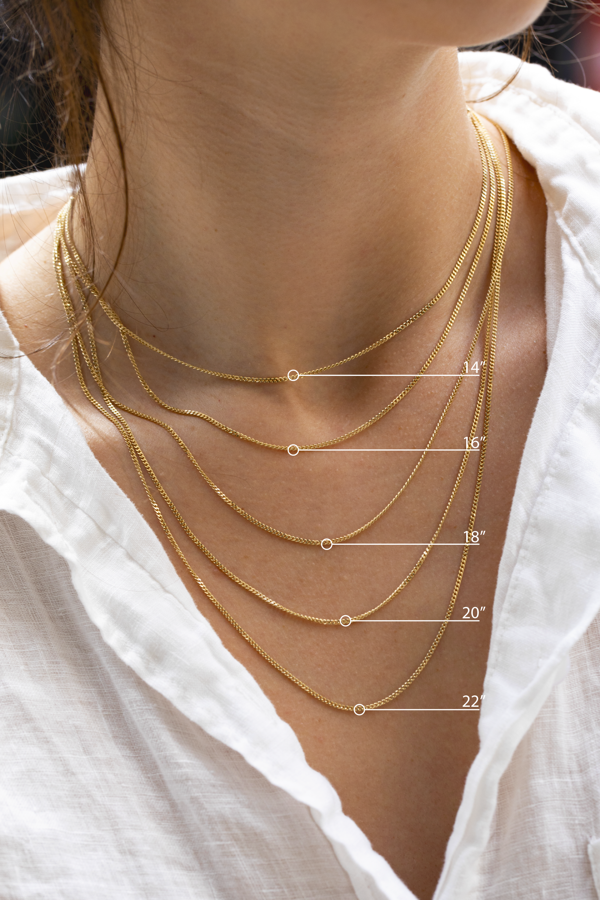 16” is the most popular length for a necklace. Sits gently around the base of theneck on top of the clavicle. Perfect with V-necks, scoop necks, boat necks, andbutton-up blouses