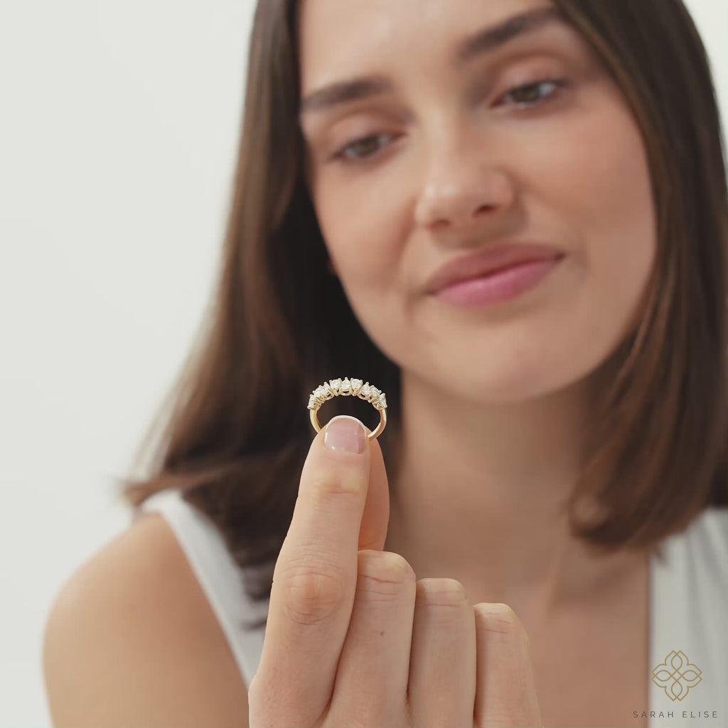 Make a statement of modern elegance with this distinctive lab-grown diamond wedding ring. Crafted in 10k, 14k, or 18k gold, this band showcases a captivating arrangement of ethically sourced, brilliant lab-created pear-shaped diamonds set in an alternating "north-south" direction.
