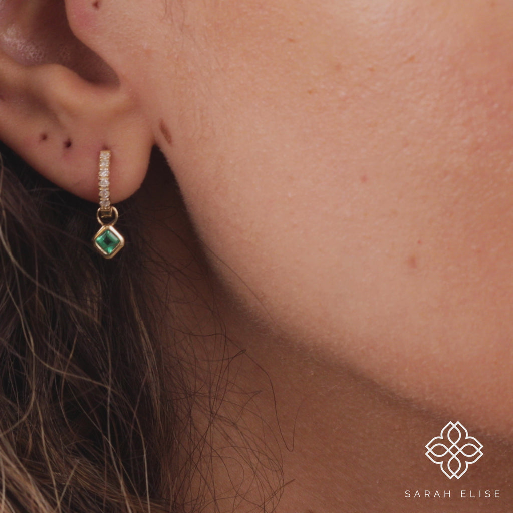 Add a touch of sophisticated elegance to your everyday look with this captivating Emerald Huggie Charm Set. This set features stunning emerald gemstones in a unique Asscher cut, meticulously set in polished 14k gold (available in classic yellow, white, or romantic rose gold) and hang from lined huggie hoops for timeless elegance. This set can be purchased together as a complete look or you have the option to purchase them separetly.