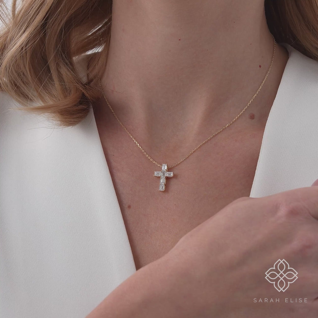 Embrace a modern, architectural expression of faith with our handcrafted Baguette Lab-Grown Diamond Cross Necklace. Meticulously forged in your choice of solid 10k, 14k, or 18k gold, this striking pendant features six shimmering baguette-cut lab-grown diamonds. The sleek, rectangular silhouette of the baguette cut offers a sophisticated "hall-of-mirrors" effect, creating a clean and contemporary cross design that radiates a refined, linear light.