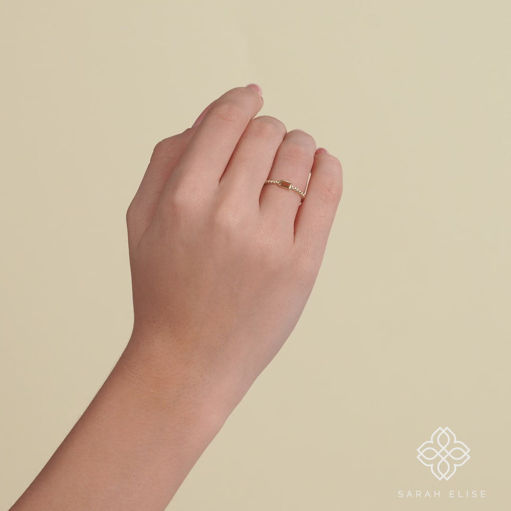 Capture the warmth and joy of sunshine with this delightful Dainty Citrine Ring. This exquisite piece features a captivating baguette-cut citrine, radiating a vibrant yellow hue that evokes happiness and positivity. The citrine is gracefully set on a delicate, textured band crafted in your choice of 10k,14k, or 18k solid gold, further adorned with petite beads for an added touch of charm.