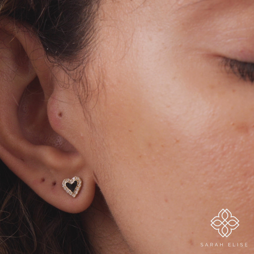Gold Black Enamel Heart Earrings with Natural White Diamonds