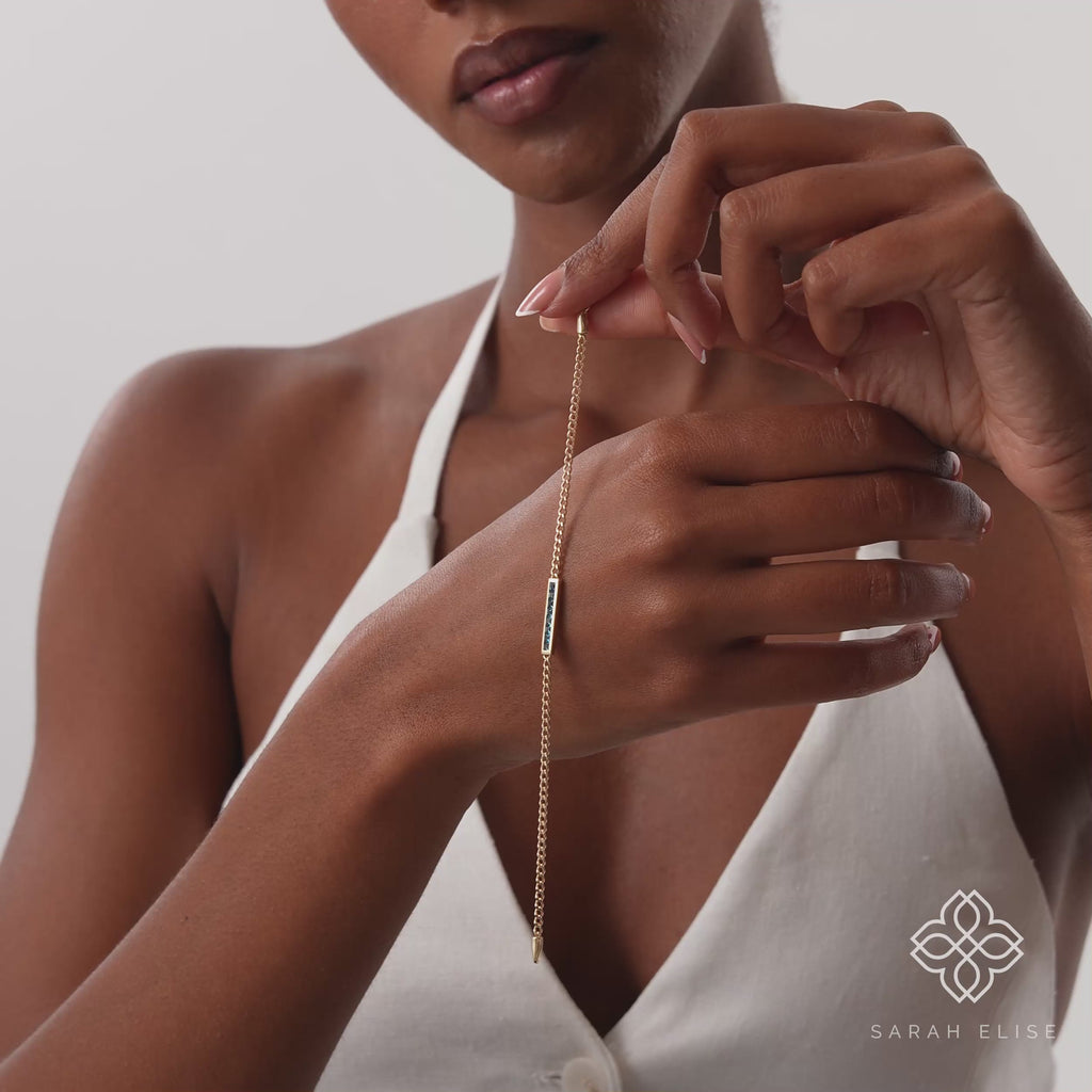 Unleash your unique style with our captivating Solid Gold Blue Topaz Curb Chain Bracelet. This beautiful piece features a delicate, solid gold curb chain centered with a striking bar of vibrant, natural London blue topaz. Each princess-cut gemstone is seamlessly channel-set, creating a smooth, continuous line of rich purple around your wrist.