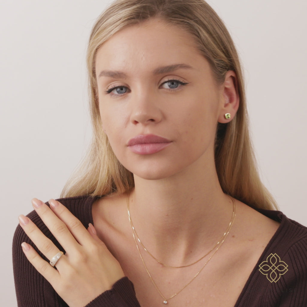 These bold gemstone studs showcase the captivating beauty of cushion-cut peridots, the birthstone for August. Known for their refreshing lime green hue, peridots exude a vibrant energy that will brighten any look. These earrings are a perfect blend of minimalist design and statement style, making them a versatile addition to your jewelry collection.