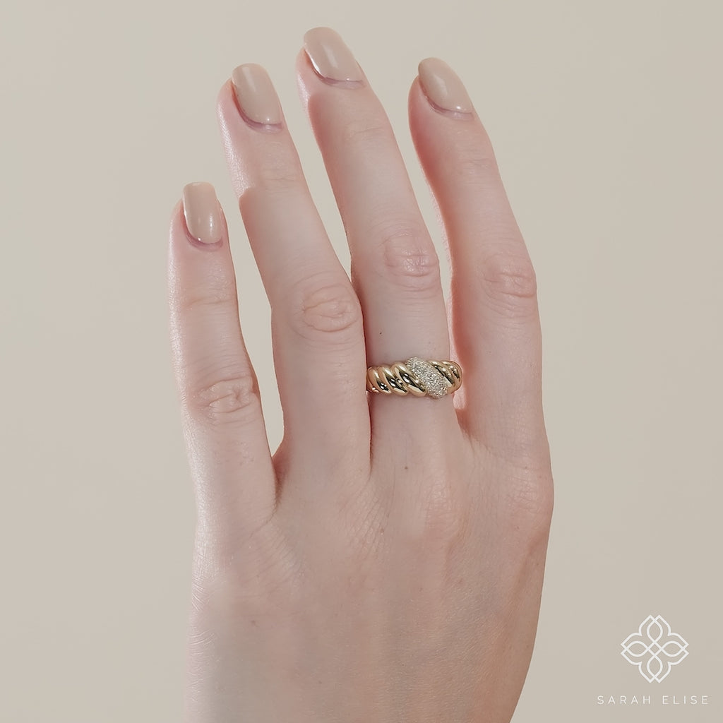 This distinctive piece combines the classic croissant motif with a chunky and modern design. Crafted in solid gold, the dainty ring exudes a luxurious feel, while the embedded natural diamonds add a touch of glamour and sophistication. This eye-catching jewelry is perfect for your wife, sister, or mom.