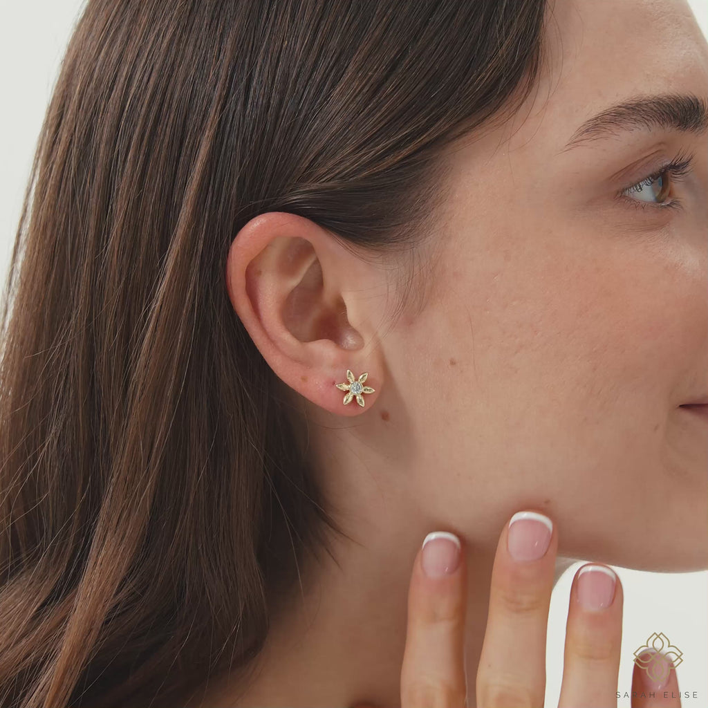Adorn your ears with these sweet and elegant solid gold six-petal flower stud earrings, each featuring a dazzling lab-grown diamond at its center. The delicate floral design adds a touch of nature-inspired beauty to any look. Crafted from your choice of 10k, 14k, or 18k solid gold, these earrings are perfect for adding a subtle sparkle to your everyday style or a touch of brilliance to a special occasion. The secure post backing ensures comfortable and worry-free wear. A lovely and timeless gift for yourself or a loved one.