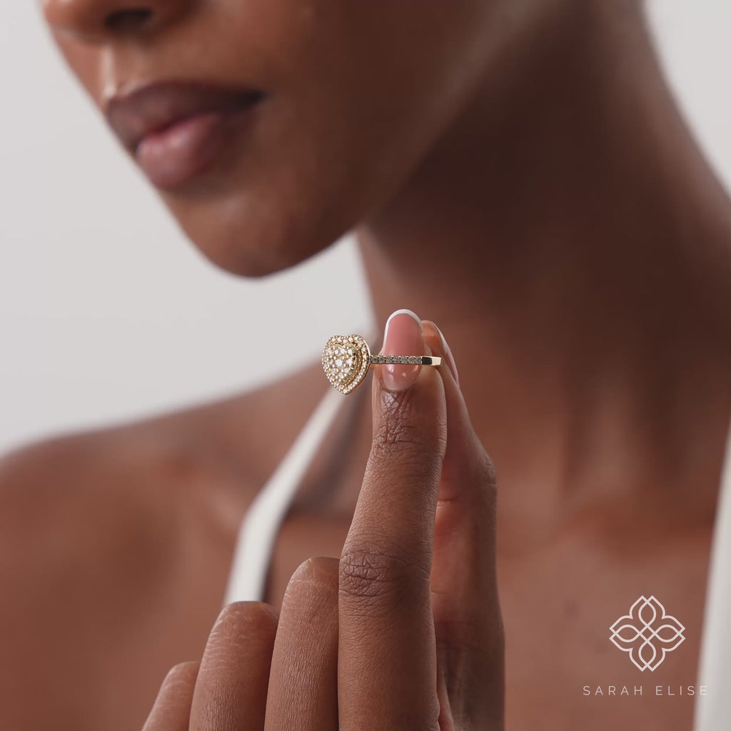 This stunning solid gold diamond heart ring is the perfect way to express your love. The ring features a delicate heart-shaped design, made up of a cluster of sparkling diamonds. The diamonds are pave-set, which means that they are set very close together, creating a continuous surface of sparkle.