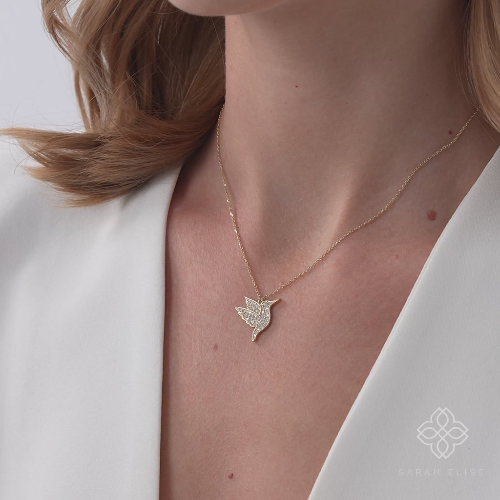Capture a moment of grace and energy with our handcrafted Lab Grown Diamond Hummingbird Pendant. Meticulously forged in your choice of solid 10K, 14K, or 18K gold, this exquisite pendant features a beautifully detailed hummingbird. The wings and body are intricately pavé-set with shimmering round brilliant lab-grown diamonds, creating a continuous surface of radiant light that mimics the iridescent flutter of a real hummingbird.