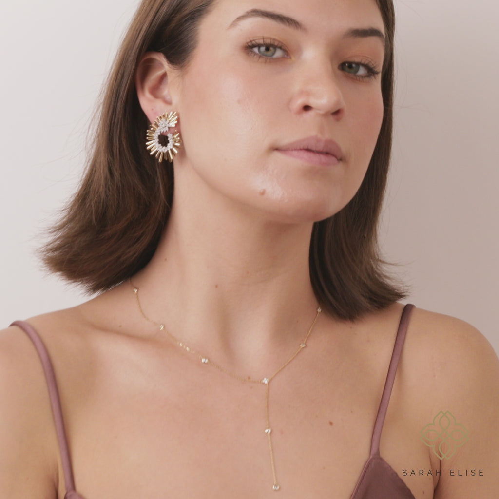These stunning earrings are a masterpiece of modern design and exquisite craftsmanship. Crafted with solid gold and adorned with sparkling diamonds, these earrings exude elegance and sophistication. The unique asymmetrical design, featuring a cluster of diamonds and a radiating sunburst of gold, creates a bold and eye-catching statement. Perfect for the woman who loves to make a statement, these earrings are sure to turn heads.