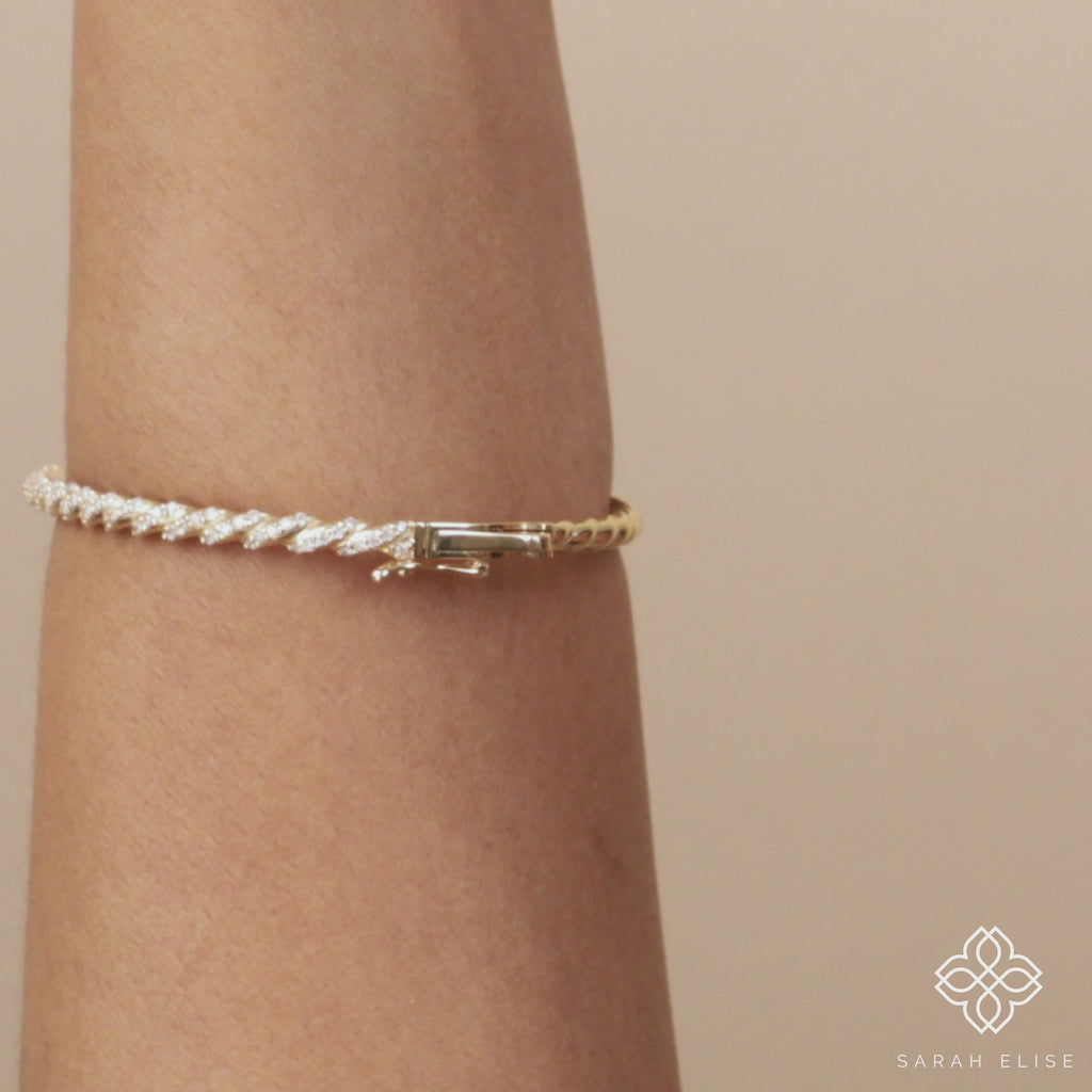 Elevate your style with our Diamond Twisted Bangle. This solid gold diamond bracelet is comfortable to wear, adorned with natural white diamonds. Handmade with precision, it's a dainty and elegant piece, perfect as an anniversary gift or for any special occasion.