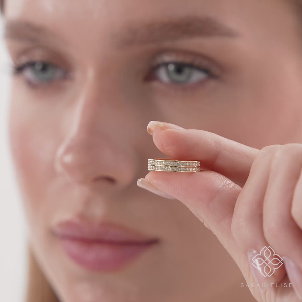 Meticulously forged in lustrous solid gold, this exquisite ring features two parallel rows of shimmering micro-pavé natural diamonds that encircle the entire band. Its sleek, low-profile design makes it the perfect companion to an engagement ring or a sophisticated stand-out piece in a personalized ring stack.