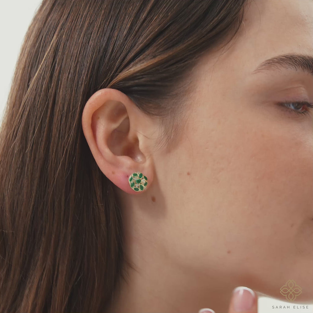 Beautiful solid gold stud earrings, each showcasing a captivating cluster of vibrant natural emeralds. These precious green gems are artfully surrounded by brilliant diamonds, adding a touch of sparkle and elegance to a classic design.