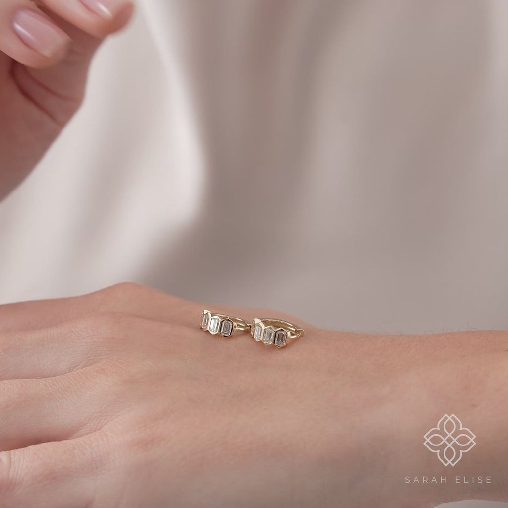 Define your signature look with the brilliant, limitless sparkle of our handcrafted Lab-Grown Diamond Huggie Earrings. Meticulously forged in your choice of solid 10k, 14k, or 18k gold, these essential hoops are set with a continuous row of shimmering emerald cut lab-grown diamonds. Designed to sit closely and comfortably against the earlobe, these huggies offer a seamless stream of light that brings a sophisticated glow to your everyday style.