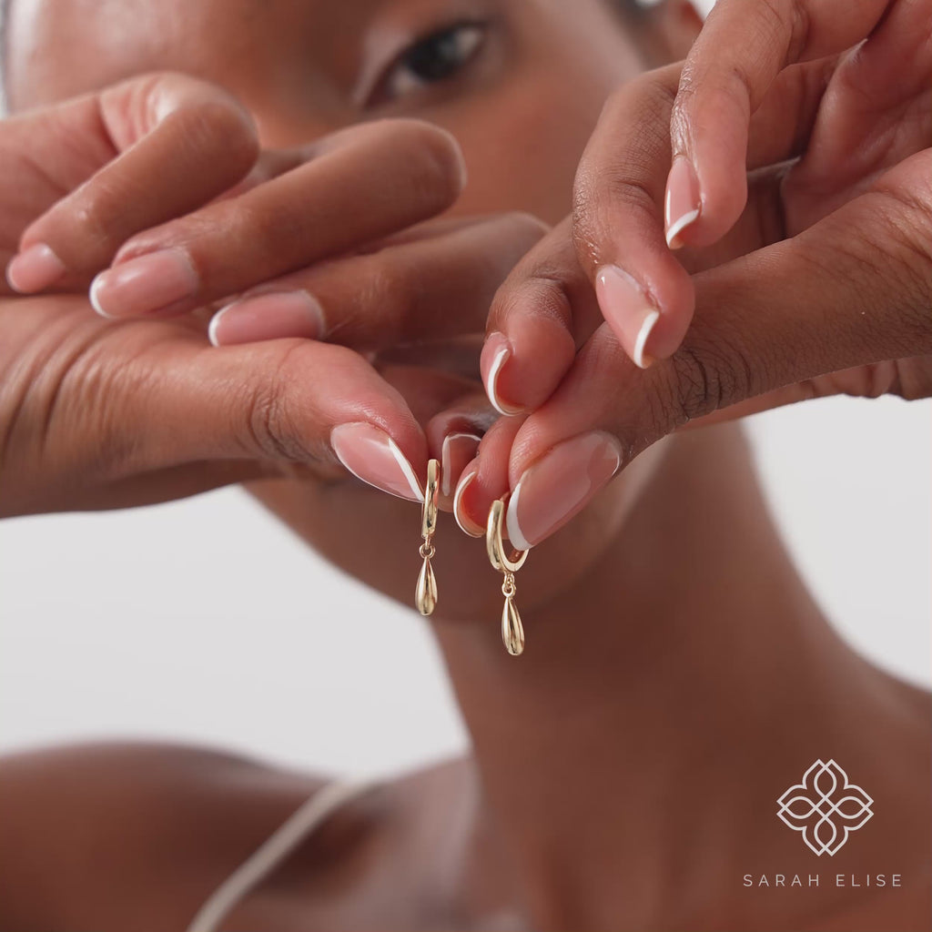 Embrace your style with a touch of fluid elegance in our Gold Dangle Huggie Hoop Earrings. Skillfully crafted in lustrous solid gold, these exquisite earrings feature a captivating, polished charm that gracefully suspends from a polished huggie hoop. The clean lines and effortless movement of the dangle create a beautiful, minimalist statement.