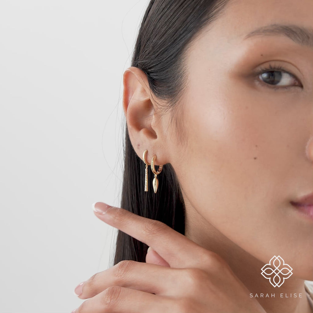 Make a sleek and modern statement with our Gold Spike Dangle Huggie Hoop Earrings. Crafted in lustrous solid gold, each earring features a comfortable huggie hoop from which a perfectly polished, distinctive spike or bullet-shaped charm gracefully dangles. This minimalist yet edgy design offers a contemporary twist on classic gold hoops.