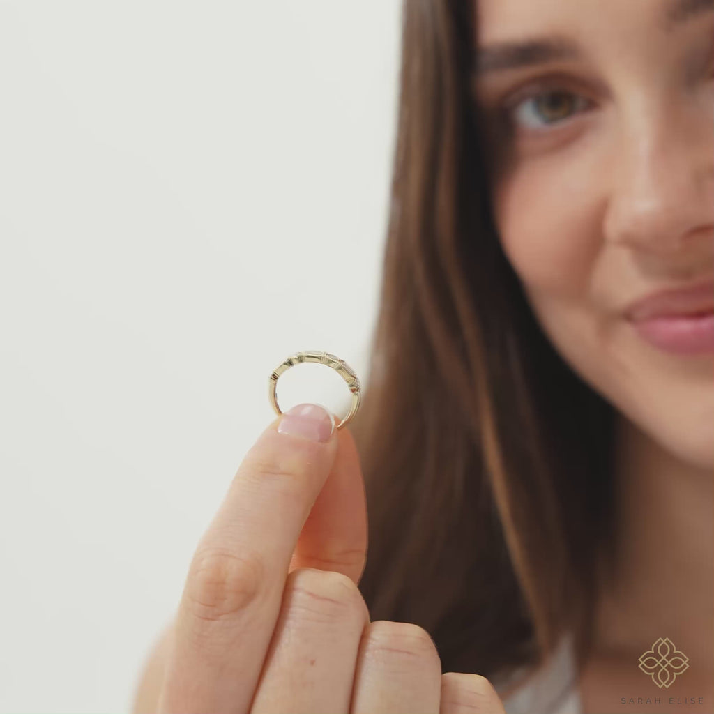 Celebrate your distinctive love with this captivating lab-grown diamond wedding band. Crafted in 10k 14k, 18k gold, this modern ring features a harmonious and unique arrangement of ethically sourced, brilliant lab-created emerald and round cut diamonds, each securely nestled within a sleek bezel setting for a contemporary and comfortable statement of your individual bond.