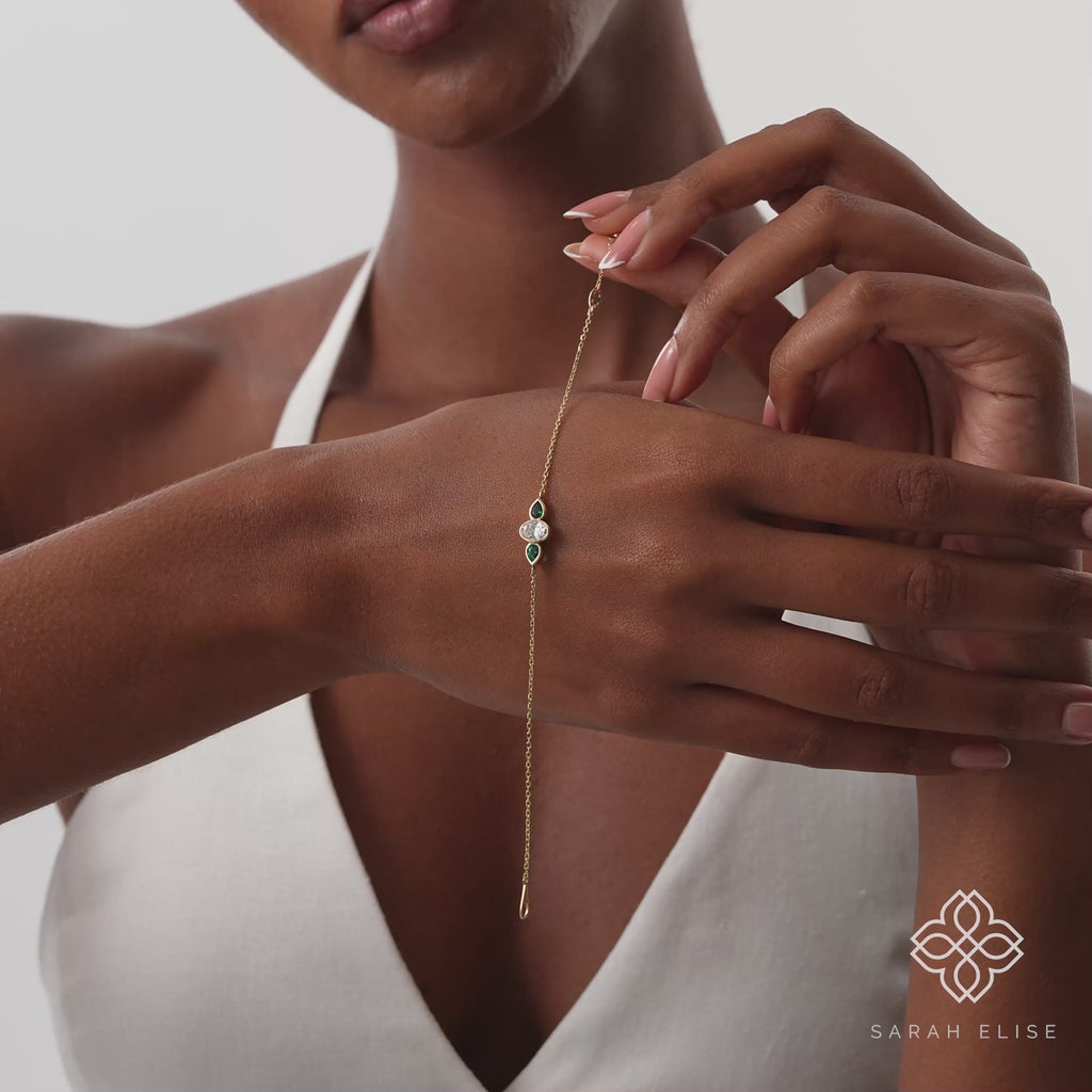 Unleash your unique style with our captivating Solid Gold Three Stone Bracelet. This beautiful piece features a central cluster of three brilliant lab-grown gems: a stunning oval diamond flanked by two vibrant pear-shaped emeralds. Each gem is meticulously bezel-set, creating a sophisticated and sleek line of sparkle and color.