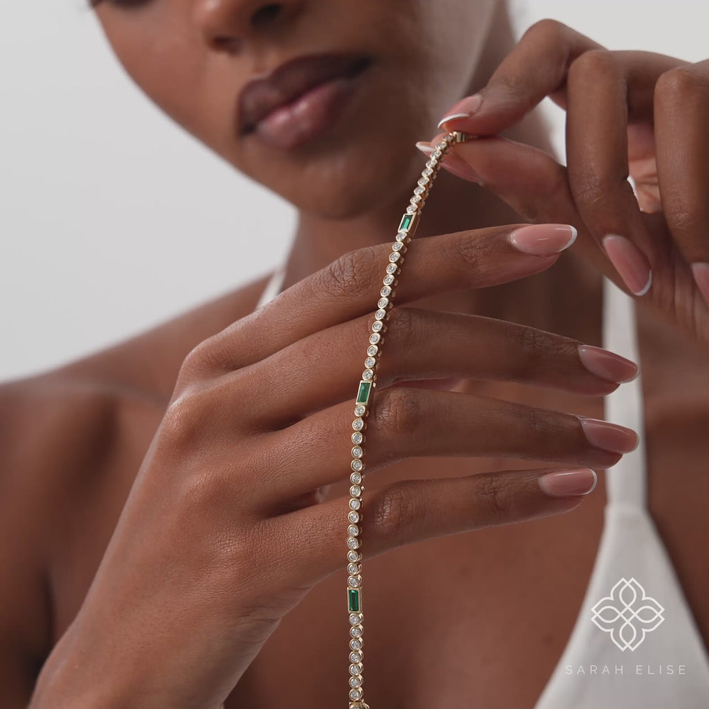 A vibrant centerpiece of emerald and diamond finds its home in this stunning bracelet. Crafted in lustrous solid gold, this exquisite piece features a continuous line of brilliant round lab-grown diamonds, meticulously set in sleek bezels. At the heart of the bracelet, a magnificent emerald-cut lab-grown emerald takes center stage, its captivating green hue providing a beautiful contrast and a unique focal point.