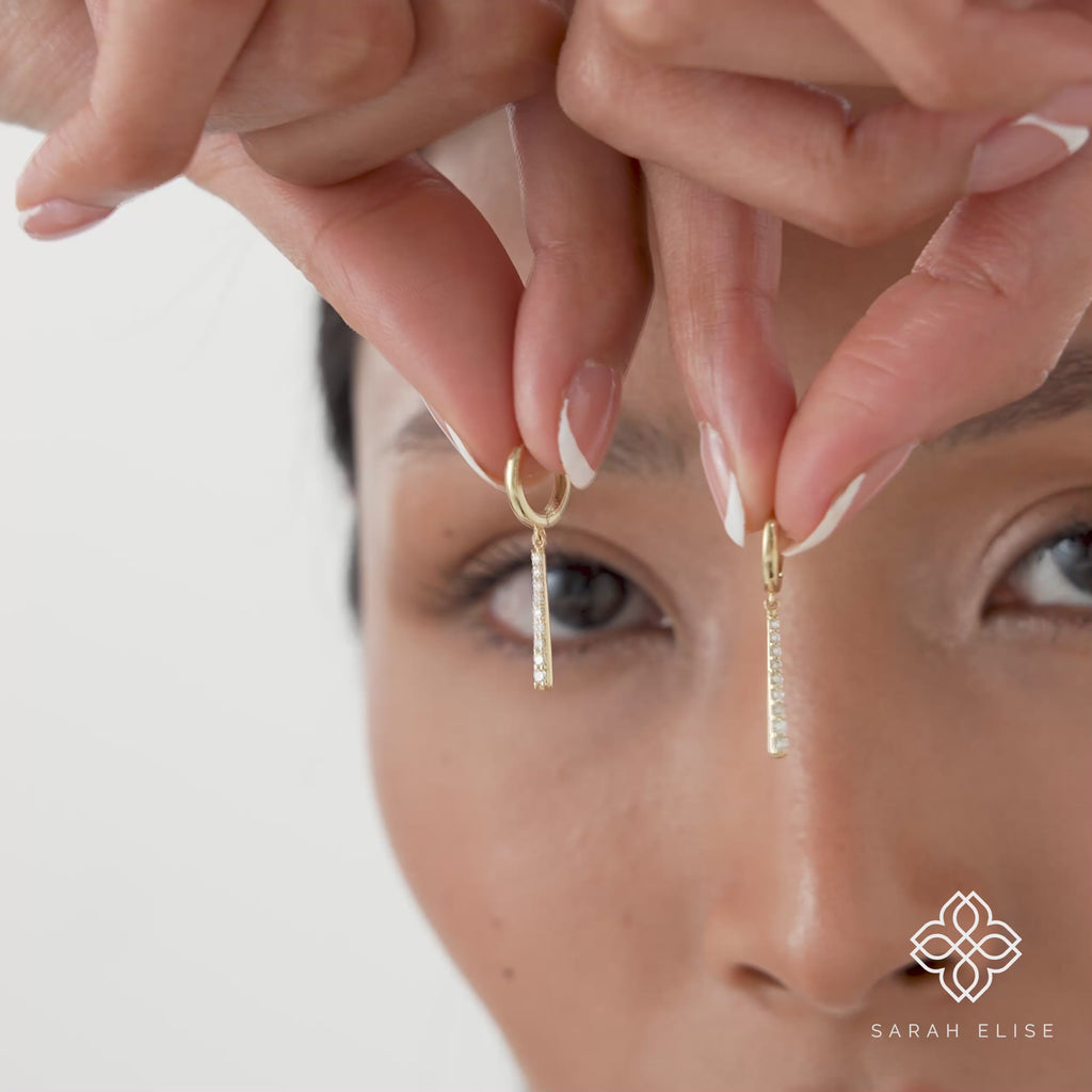 Make a sleek and sophisticated statement with our Lab Grown Diamond Bar Dangle Huggie Hoops. Crafted in lustrous solid gold, each earring features a comfortable huggie hoop from which a perfectly straight, slender bar adorned with brilliant round lab-grown diamonds gracefully suspends. The diamonds are meticulously set to create a continuous line of sparkle, emphasizing their modern aesthetic.
