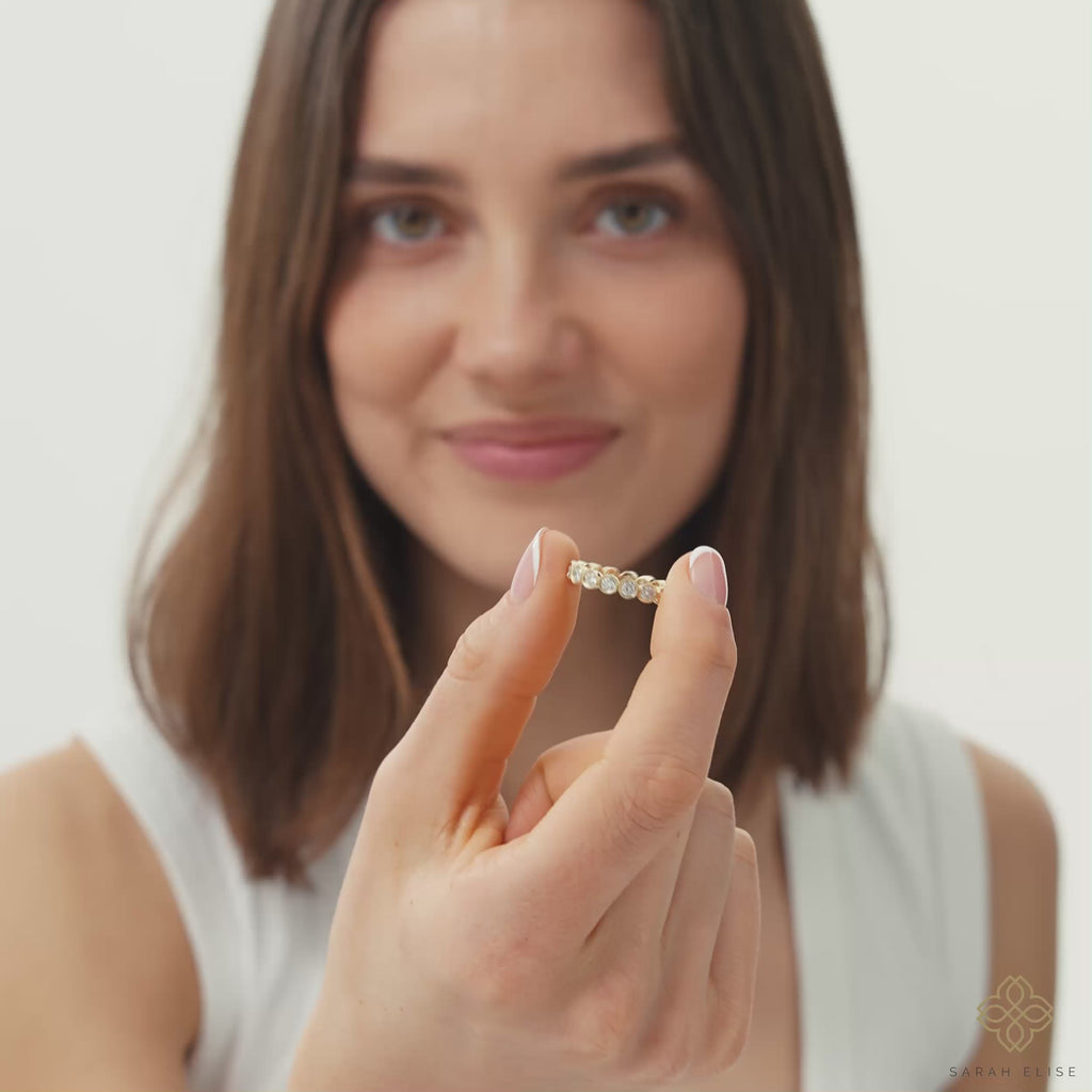 This elegant full eternity ring features brilliant 3.7mm round-cut lab-grown diamonds, each securely and smoothly set in a classic bezel. The consistent size of the stones creates a delicate yet impactful band of continuous sparkle. Crafted in solid 10k, 14k, or 18k gold, this ring offers a timeless and comfortable design, perfect for everyday wear or as a symbol of everlasting love.