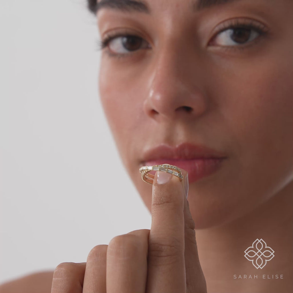 Embrace your style with a piece that truly stands out: our X-Ring Lab Grown Diamond Ring. This exquisite piece is a modern masterpiece, crafted in lustrous solid gold. The band forms a graceful criss-cross, with one side showcasing the clean, linear brilliance of baguette lab-grown diamonds and the other dazzling with the classic sparkle of round lab-grown diamonds.