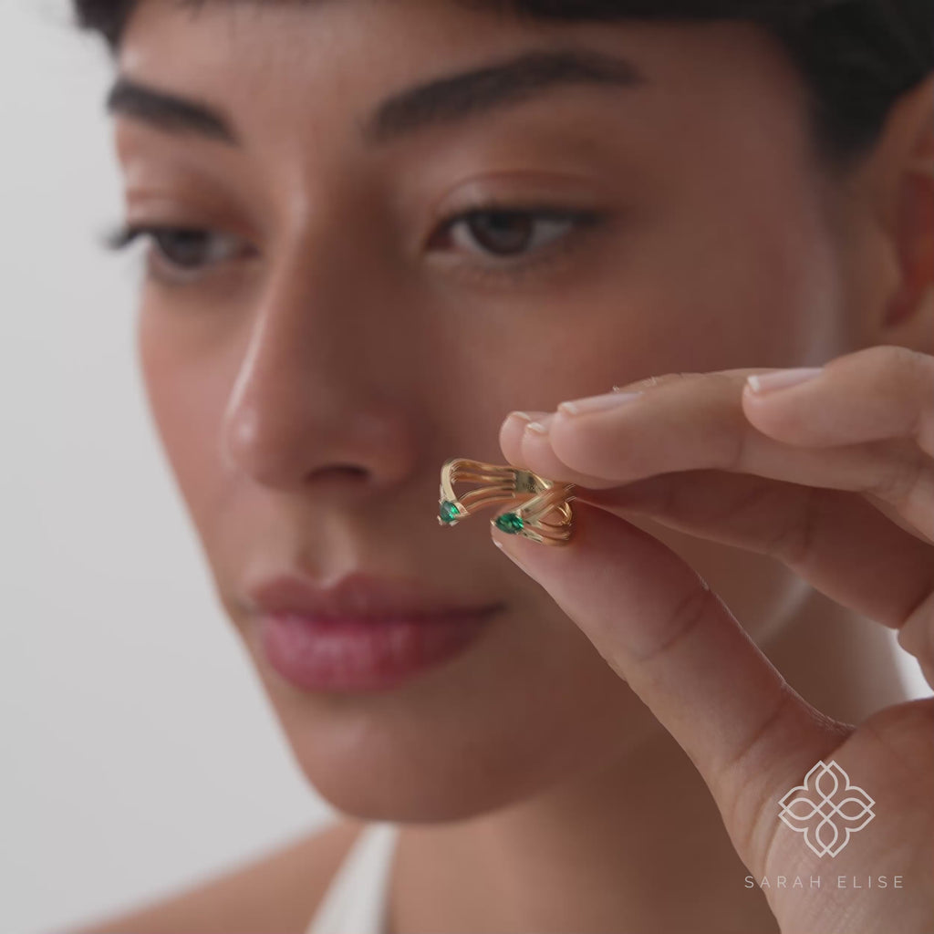 Embrace your style with a piece that truly stands out: our Lab Grown Emerald Open Ring. This exquisite bypass-style ring is a modern masterpiece, crafted in lustrous solid gold. The band forms a graceful curve, beautifully showcasing two captivating pear-shaped lab-grown emeralds. Each gem is meticulously bezel-set, highlighting its unique elongated shape and creating a striking display of vibrant green.