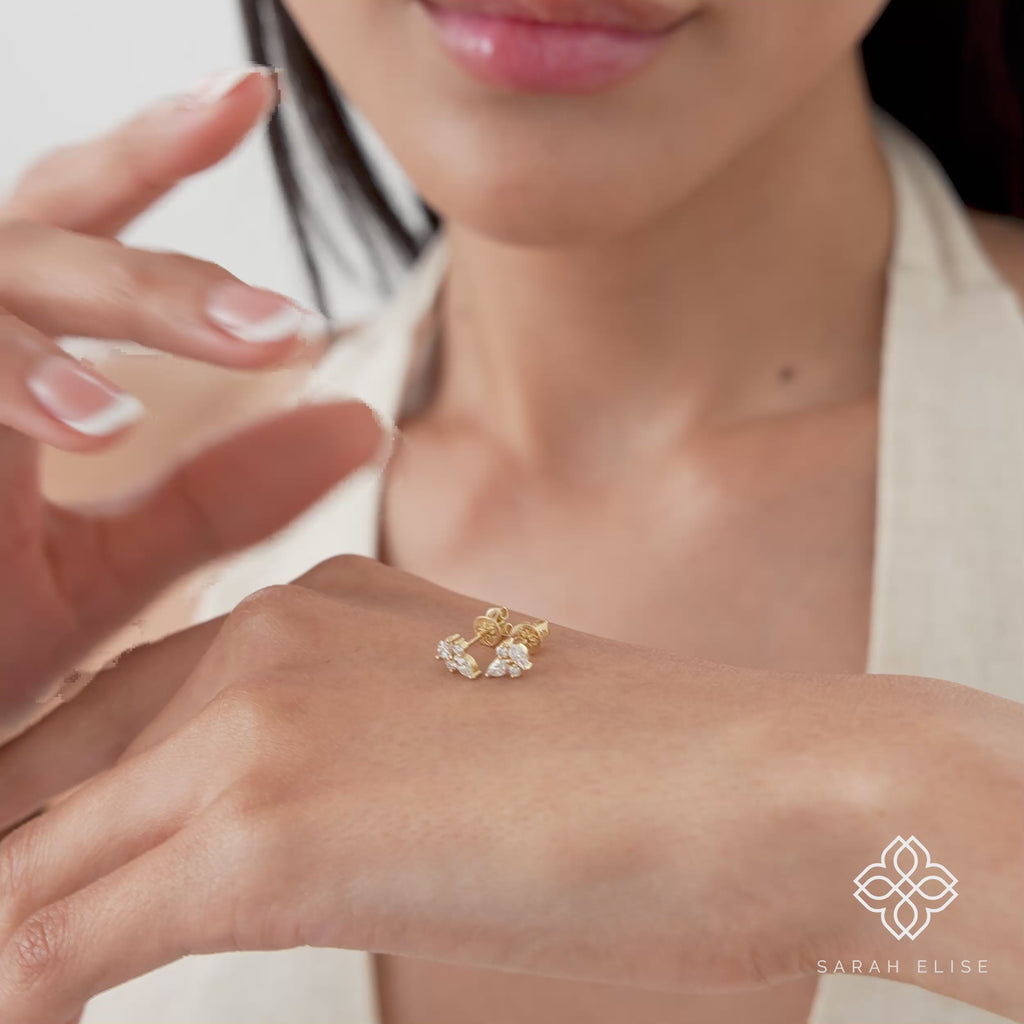 Illuminate your look with our enchanting Mixed Cut Lab Grown Diamond Cluster Stud Earrings. Crafted in lustrous solid gold, each earring features a brilliant arrangement of marquise and round lab-grown diamonds, meticulously prong-set to create a captivating leafy cluster. This unique combination of diamond cuts results in a dynamic and highly sparkling design, offering a fresh take on classic diamond studs.