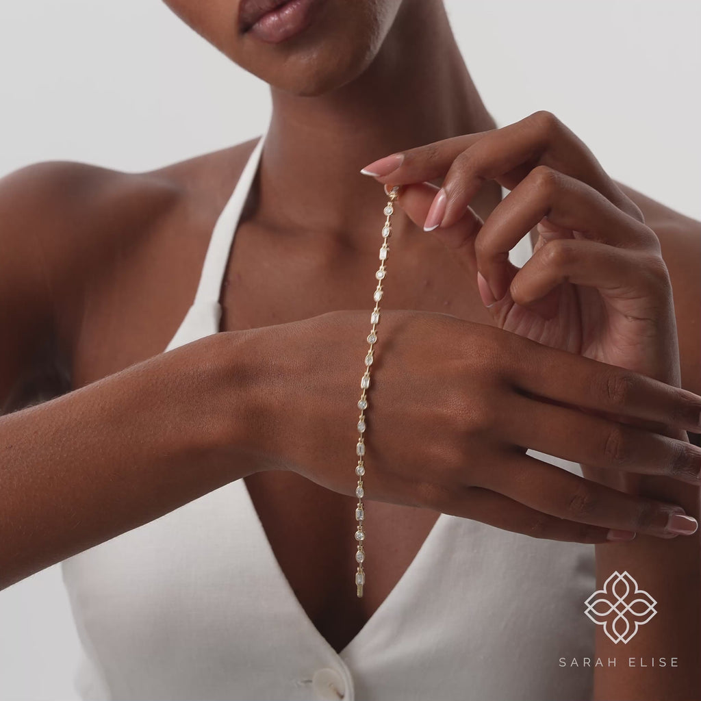 A captivating mosaic of sparkle finds its home in this stunning bracelet. Crafted in lustrous solid gold, this exquisite piece features a beautiful medley of lab-grown diamonds in various classic shapes, including round, oval, emerald cuts. Each gem is meticulously set in a sleek, protective bezel, creating a fluid and continuous line of diverse brilliance.