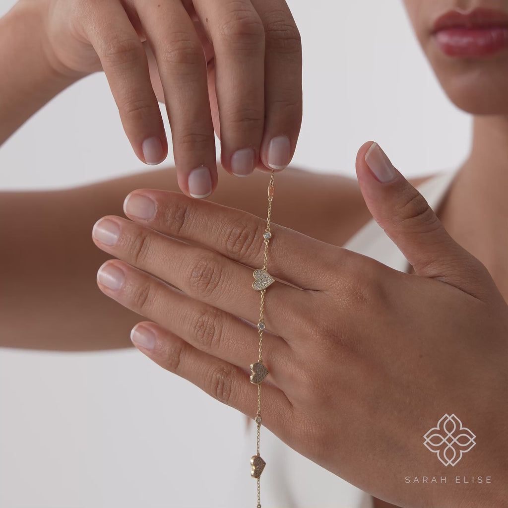 Bring a touch of timeless sentiment to your collection with our Pave Heart Station Bracelet. Crafted in lustrous solid gold, this exquisite piece features three luminous pave diamond heart charms. These central charms are beautifully spaced and flanked by sparkling round natural diamonds, creating a dainty yet captivating arrangement across the center of the wrist.