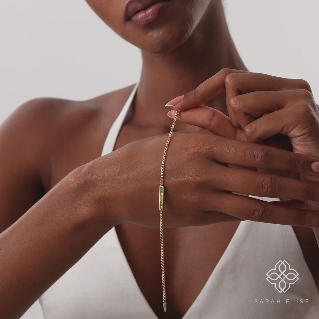 Unleash your unique style with our captivating Solid Gold Peridot Bar Bracelet. This beautiful piece features a delicate, solid gold chain centered with a striking bar of vibrant, natural peridots. Each small, square-cut gemstone is seamlessly channel-set, creating a smooth, continuous line of fresh green around your wrist.