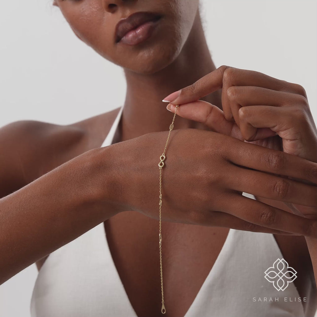 Introduce a touch of timeless symbolism to your jewelry collection with our Solid Gold Infinity Bracelet. This refined piece features a delicate solid gold chain gracefully adorned with multiple infinity symbols, each precisely spaced to create a balanced and elegant design. Representing the concept of endlessness, this bracelet serves as a beautiful reminder of enduring bonds and limitless possibilities.