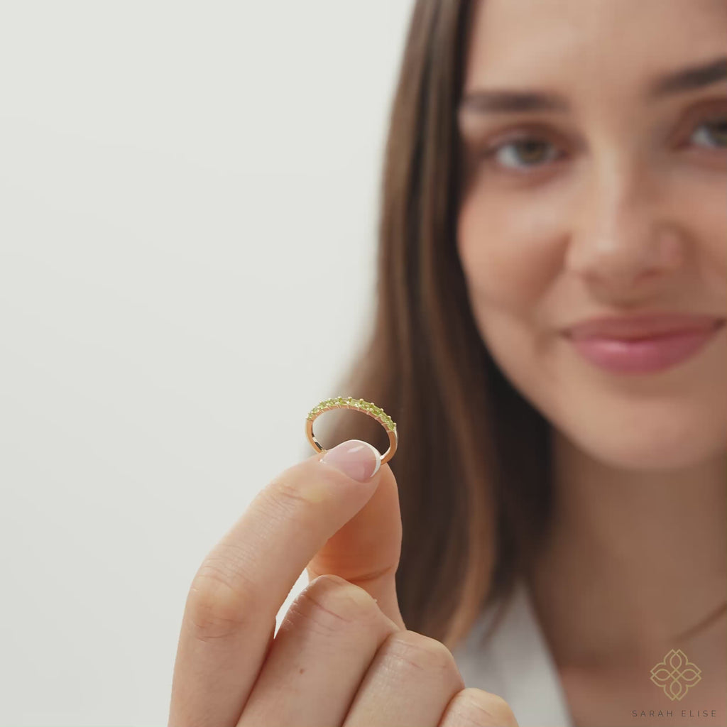 This delightful ring showcases vibrant princess-cut peridot gemstones, beautifully set in 10k, 14k, or 18k gold. The clean, geometric lines of the princess cut perfectly complement the lively green hue of the peridot, creating a fresh and modern aesthetic. This ring is a wonderful way to add a touch of natural color to your everyday wear or makes a thoughtful and unique gift.