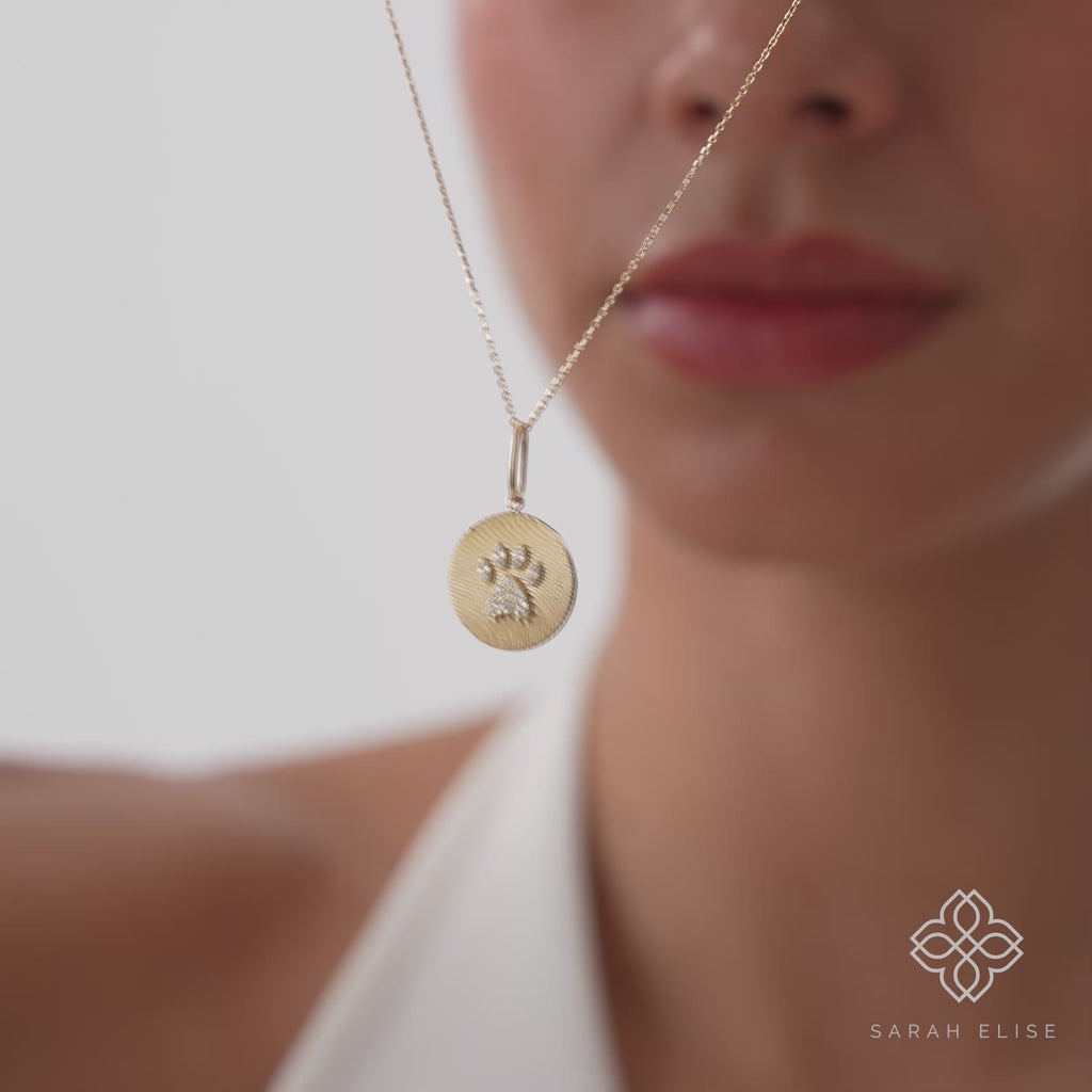 Celebrate the special bond with your furry friend with our enchanting Solid Gold Dog Paw Print Necklace. This unique piece features a beautifully textured round disc, crafted in radiant solid gold. At its heart, a sparkling paw print, meticulously set with brilliant lab-grown diamonds, gleams with heartfelt sentiment.