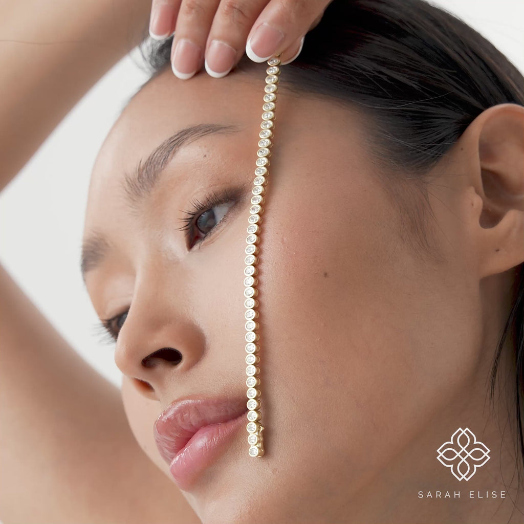 Elevate your everyday style or make a statement on special occasions with our exquisite Bezel Oval Diamond Tennis Bracelet. Crafted with precision and an eye for timeless elegance, this bracelet features a continuous line of brilliant oval-cut lab diamonds, each meticulously set in a sleek, protective bezel. This modern setting not only enhances the sparkle of each diamond but also offers a smooth, comfortable feel against your skin, making it perfect for daily wear or effortless layering.