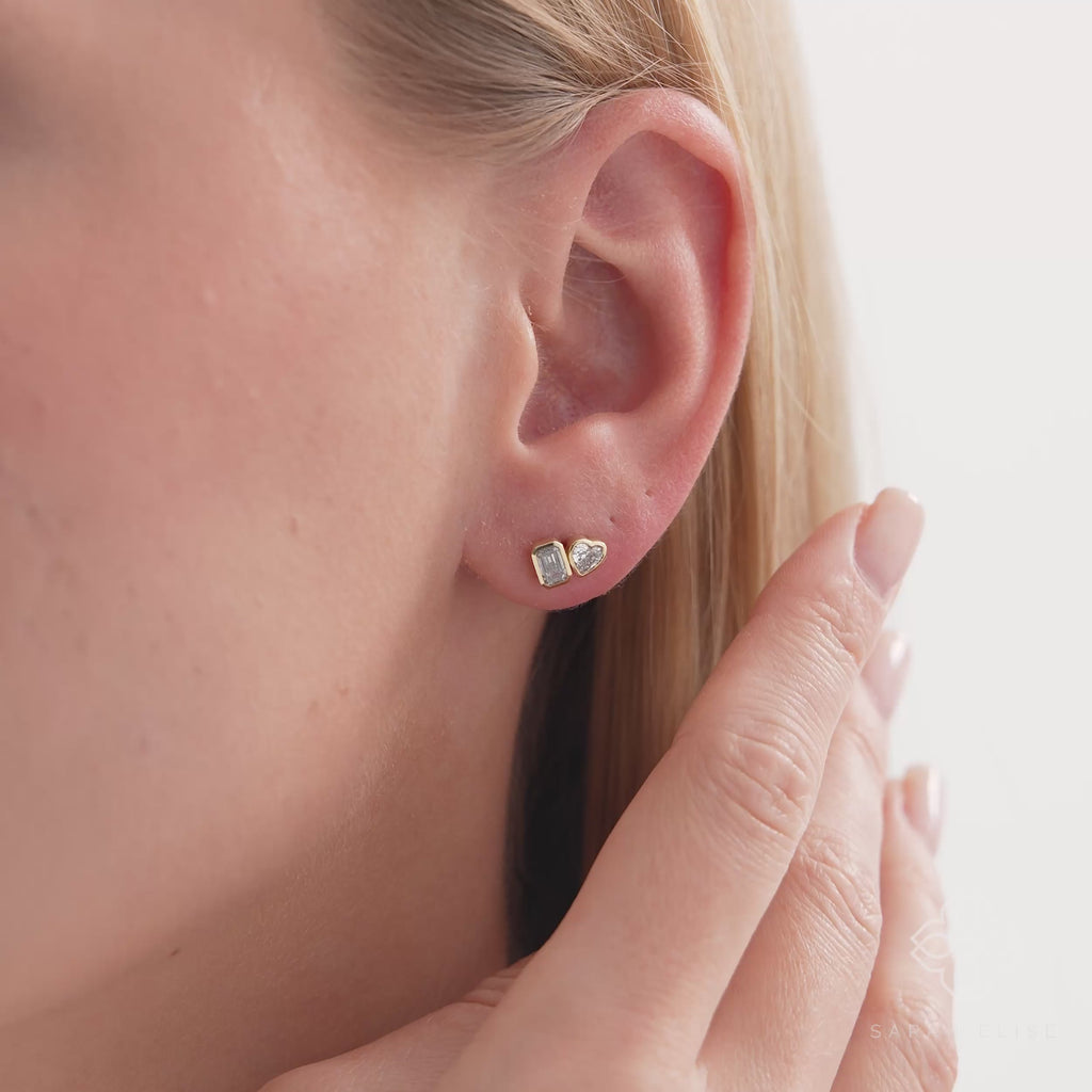 Embrace the striking contrast of geometric and fiery brilliance with our Mixed-Cut Cluster Stud Earrings. This magnificent pair is crafted in lustrous solid gold, showcasing a dominant baguette-cut lab-grown diamond that commands attention with its clean, linear sophistication. Accenting this center stone is a playful, asymmetrical cluster of smaller, round lab-grown diamonds, creating a beautiful and dynamic display of light.