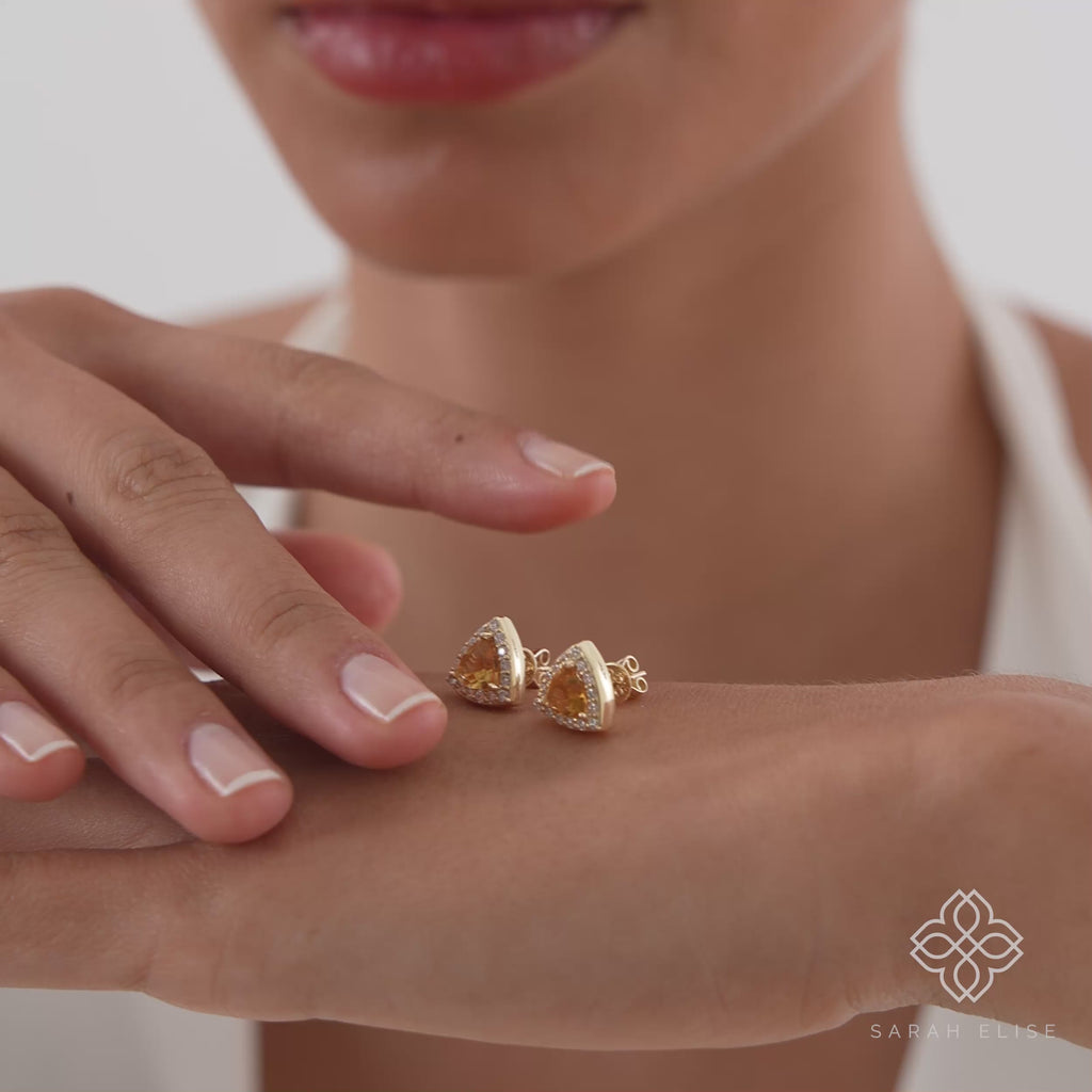 Embrace your style with a piece that truly shines: our Trillion Cut Citrine Natural Diamond Halo Studs. Crafted in lustrous solid gold, this exquisite pair features a magnificent trillion-cut natural citrine at its heart, renowned for its sunny yellow-orange hue and unique geometric brilliance. Each citrine is beautifully encircled by a dazzling halo of sparkling natural diamonds, amplifying its glow and creating a truly captivating, clustered effect.