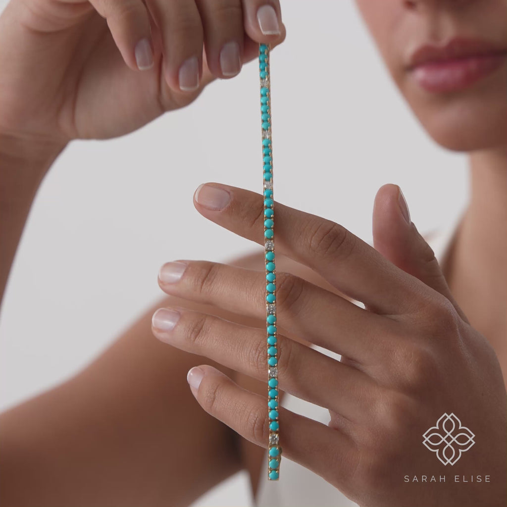 A vibrant cascade of color and light finds its home in this stunning tennis bracelet. Crafted in lustrous solid gold, this exquisite piece features a continuous line of brilliant lab-grown diamonds alternating with striking natural turquoise gemstones. The gems are meticulously set side-by-side in 4 prong settings, creating a sophisticated and seamless pattern around the wrist.