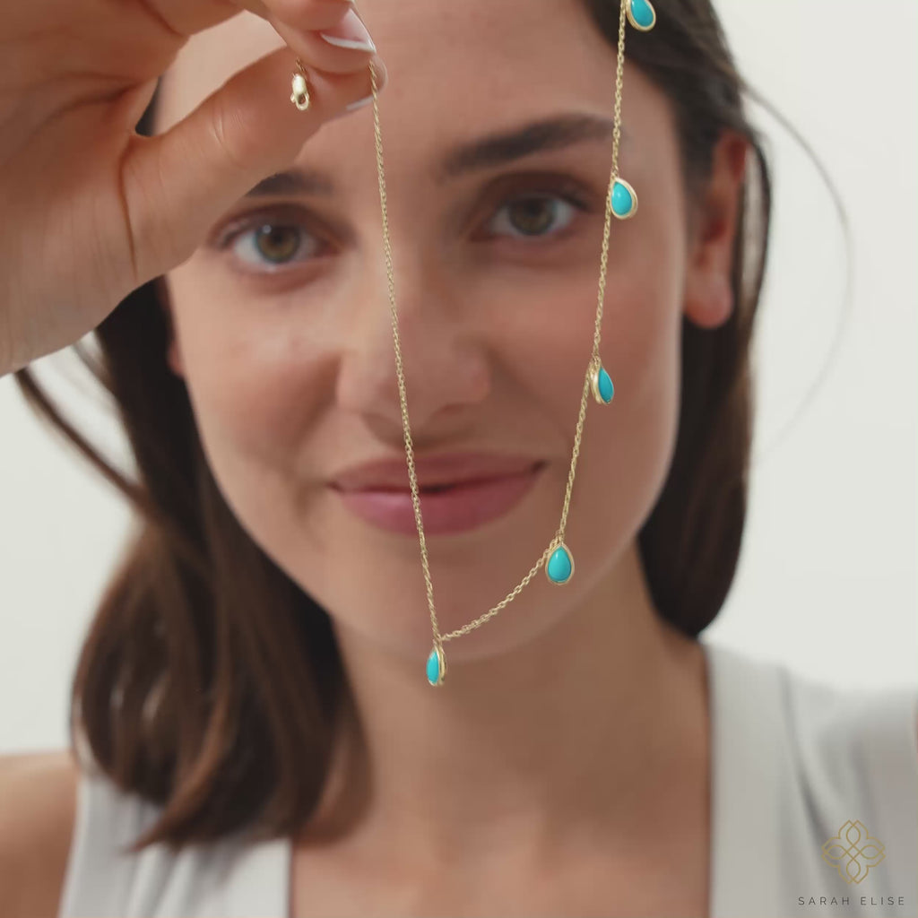 This charming necklace features delicate, pear-shaped turquoise cabochons that dangle gracefully along a fine chain. The vibrant blue of the turquoise adds a touch of bohemian elegance to any outfit. Perfect for everyday wear or as a lovely gift.