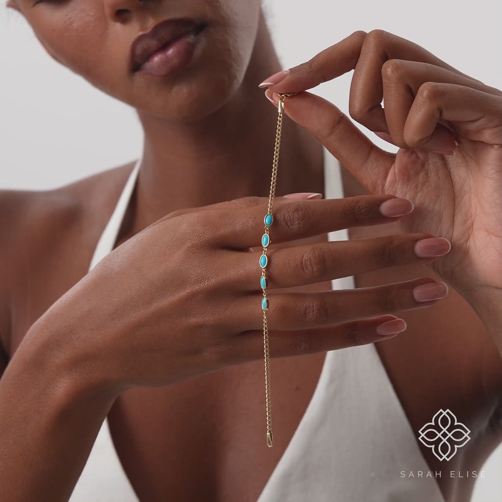 Unleash your unique style with our captivating Turquoise Cuban Chain Bracelet. This beautiful piece features a delicate solid gold Cuban chain with multiple polished oval natural turquoise stations. Each gemstone is meticulously bezel-set and spaced perfectly, creating a continuous flow of serene blue around your wrist.